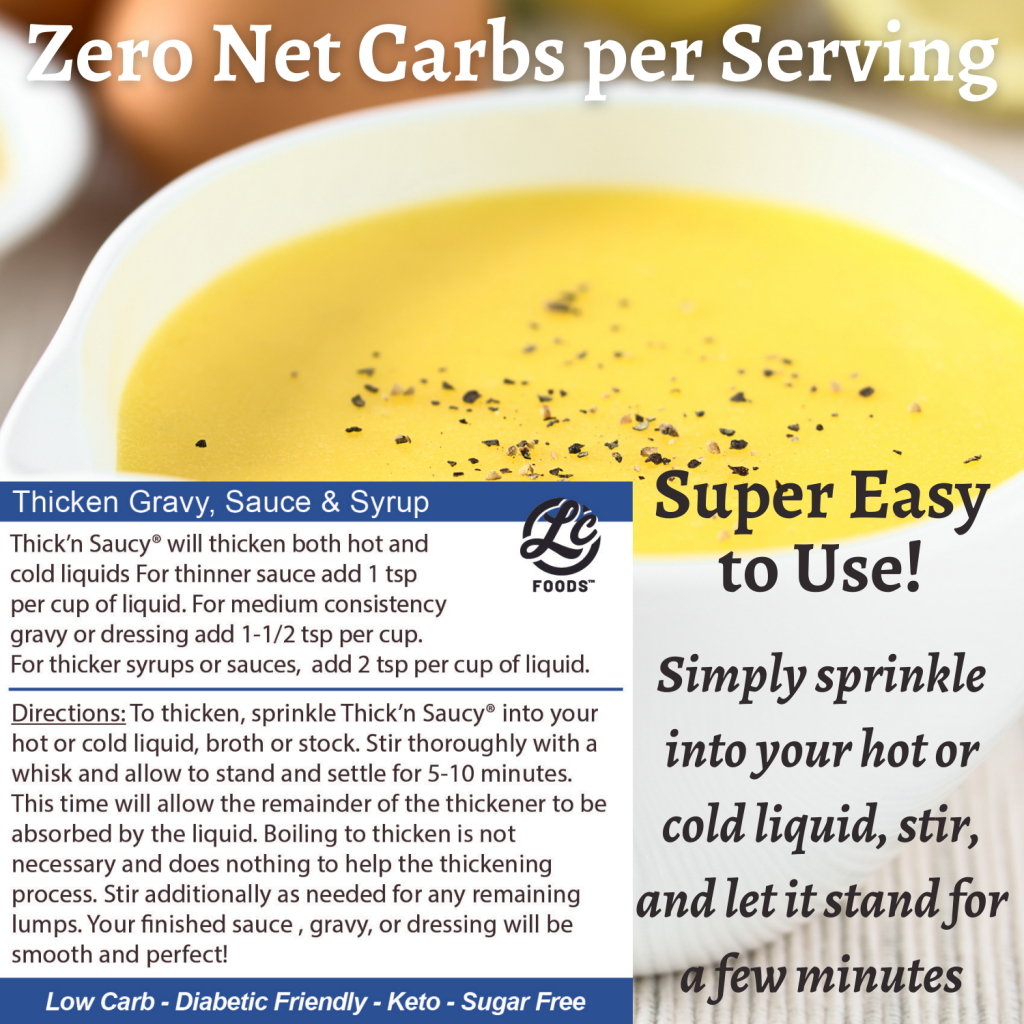 Thick n Saucy is a ZERO carb thickener that is also gluten free. You get amazing results with as little as 1 teaspoon. It has so many uses, it really is a game changer for anyone on a low carb diet. Even if you’re not concerned about carbs, it’s still the best thickening product on the market, hands down. Try it for yourself!