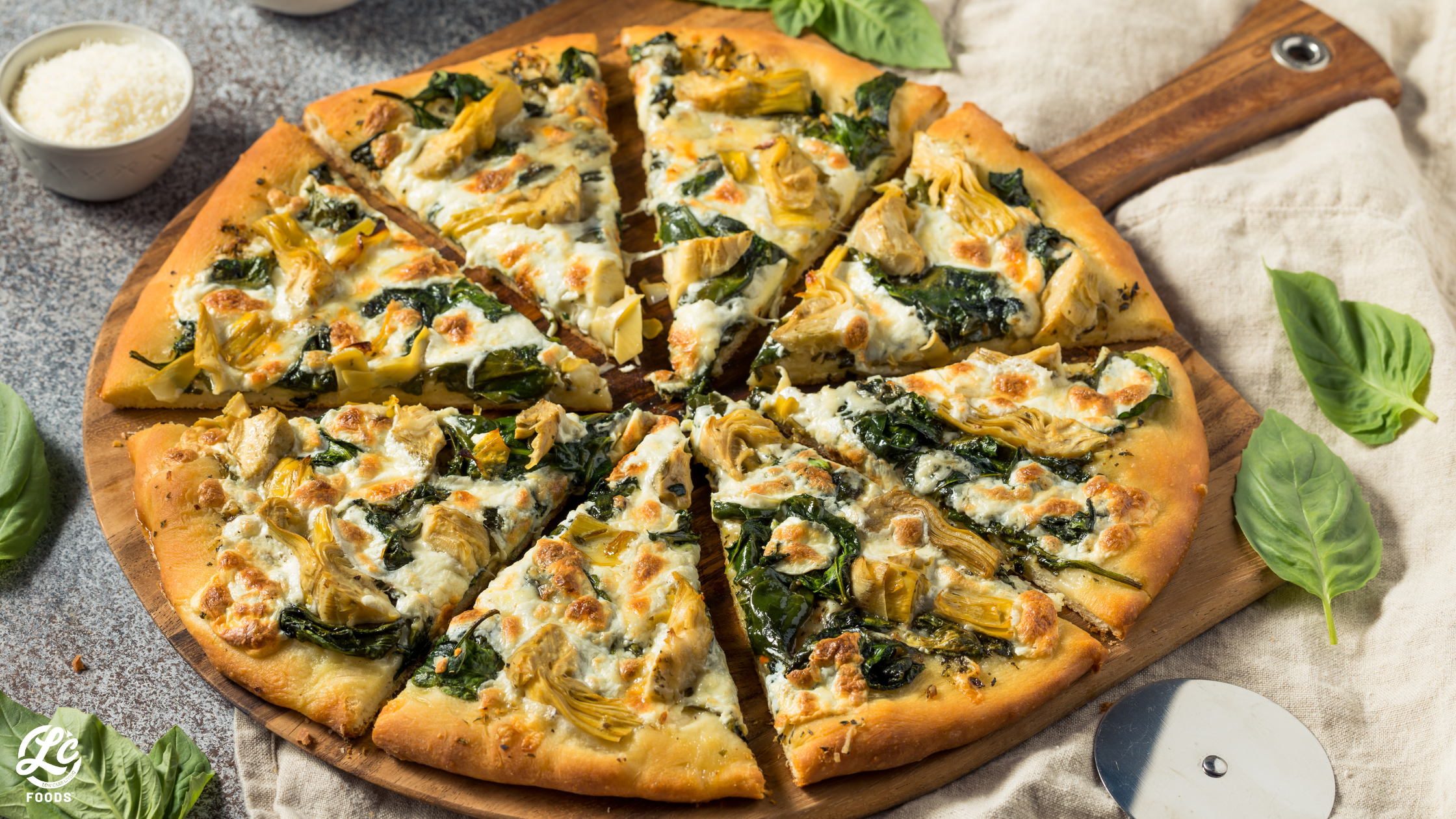For the White Sauce, melt the butter in a small saucepan over medium heat. Add the garlic and saute just until fragrant. Add the heavy cream, cream cheese, dried minced onions, basil, and Parmesan cheese. Whisk until smooth. Remove from heat and set aside.Assemble the pizza by pouring the white sauce onto the LC Thin Crust Pizza Shell. Spread evenly almost all the way to the edge. Add the diced artichokes, chicken, bacon, and spinach. Top with the shredded mozzarella. Sprinkle on the Parmesan Cheese.